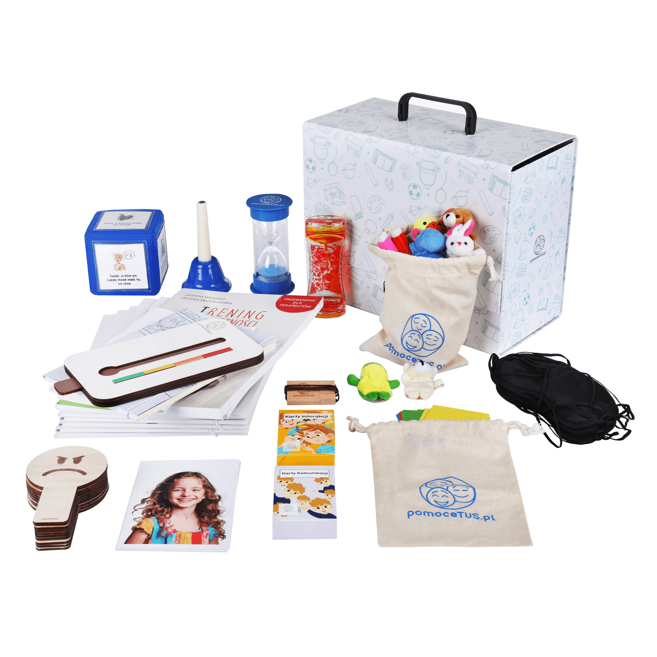 Kuferek TUS na start – szkoła podstawowa to pomoce terapeutyczne, cyfrowe oraz narzędzia i książki, które pozwolą Ci zaplanować i przeprowadzisz swoje zajęcia z grupami w wieku szkolnym od A do Z. Zawartość kuferka umożliwi Ci zaplanować cały cykl zajęć, zapoznać i zintegrować ze sobą grupę, zaktywizować dzieci do wspólnej zabawy i rozwinąć u nich umiejętności społeczne w atrakcyjny i edukujący je sposób. Dodatkowo zapewnisz uczestnikom czas na wyciszenie i relaksację, a na koniec zajęć, dzięki dobranym materiałom i narzędziom, przeprowadzisz ewaluację grupy.